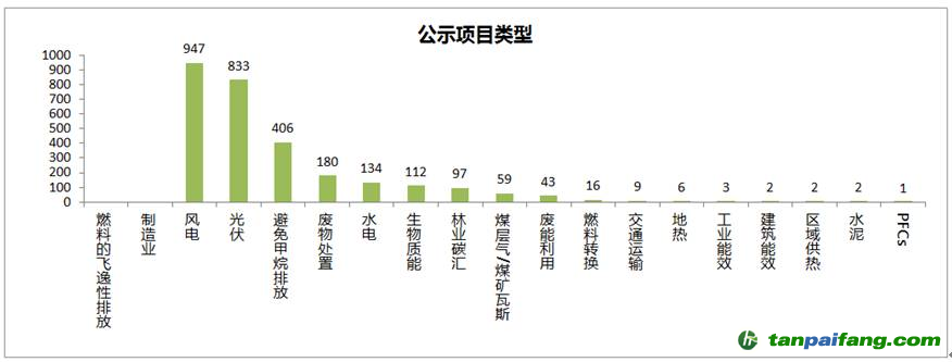 截止到2017年3月,累計公示CCER審定項目2,852個,項目備案的網(wǎng)站記錄861個;減排量備案的網(wǎng)站記錄254個,實際減排量備案項目為234個(有20個項目減排量至少備案一次,屬于項目記錄重復(fù))就公示項目類型而言,以可再生能源居多,共計2032個,占公示項目總數(shù)的71%,其中:風(fēng)電947個、光伏833個、水電134個、生物質(zhì)能112個、地?zé)?個。其次是避免甲烷排放類項目,共計406個,占公示項目總數(shù)的14%;再次是廢物處置類項目,共計180個,占公示項目總數(shù)的6%。 本*文`內(nèi)/容/來/自:中-國-碳^排-放“交|易^網(wǎng)-tan pai fang . c o m