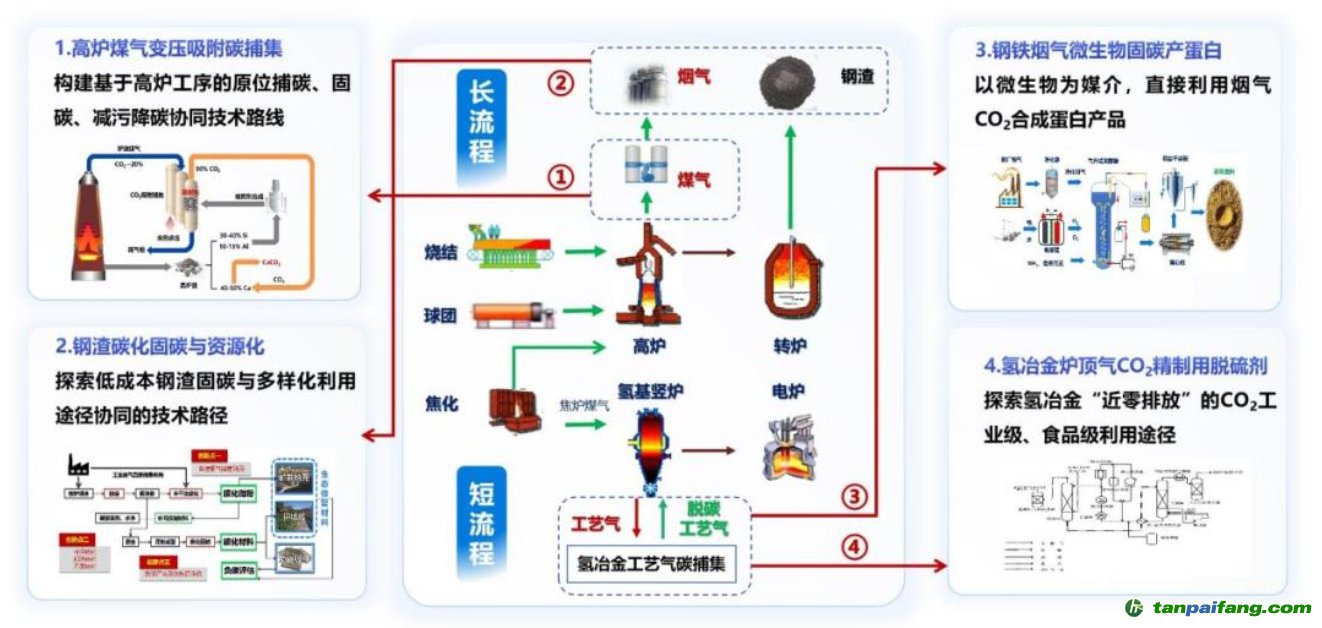 一方面,全力打造覆蓋全流程多場(chǎng)景的碳捕集解決方案,開(kāi)展適用于鋼鐵排放特點(diǎn)的捕集技術(shù)研發(fā),以大規(guī)模高效減排為目標(biāo),開(kāi)發(fā)突破性低能耗低成本技術(shù)路線;另一方面,拓展具有鋼鐵行業(yè)特色的碳利用技術(shù),開(kāi)展與鋼鐵生產(chǎn)流程深度耦合的特色CO?利用技術(shù)研發(fā),探索不同產(chǎn)品利用途徑;構(gòu)建CCUS減排量核算