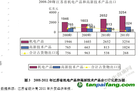 這是由于規(guī)模效應(yīng)使得江蘇省貿(mào)易出口含碳排放降低,隨著出口增長(zhǎng)從2008年7月的28.04%降到2011年10月的29.14%,規(guī)模效應(yīng)的影響也從2008年7月的20.66%降到2009年1月的3.75%,到2011年10月規(guī)模效應(yīng)對(duì)出口碳排放降幅影響高達(dá)26.85%。2011年1月結(jié)構(gòu)使得出口碳同比下降2.78%,同年10月這一數(shù)據(jù)擴(kuò)大到6.09%,由此可見(jiàn)江蘇省出口貿(mào)易結(jié)構(gòu)在逐步向低碳轉(zhuǎn)型,圖3為2008年至2011年低碳技術(shù)含量較高的機(jī)電產(chǎn)品和高新技術(shù)產(chǎn)品出口變化趨勢(shì)簡(jiǎn)圖。