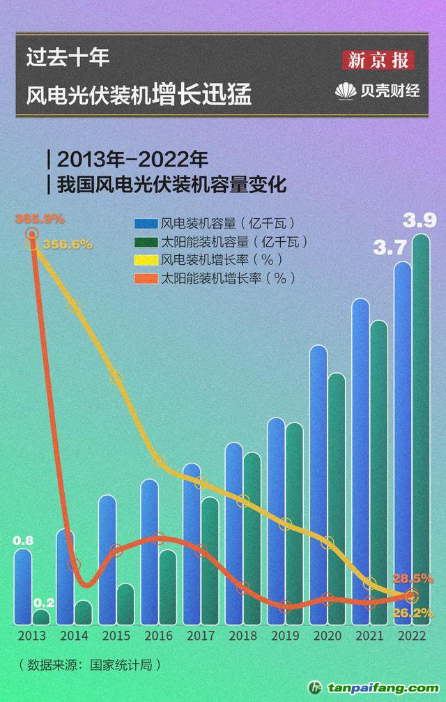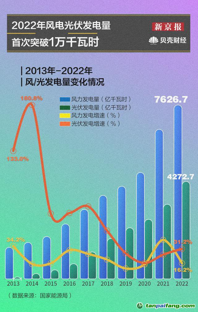 2022年我國風(fēng)電光伏年發(fā)電量首次突破1萬億千瓦時(shí),發(fā)電量增速遠(yuǎn)超其他發(fā)電方式。太陽能發(fā)電量達(dá)4272.7億千瓦時(shí),相比上年增加31.2%;風(fēng)電發(fā)電量為7626.7億千瓦時(shí),相比上年增加16.2 %。 夲呅內(nèi)傛萊源?。骇鎲┨?排*放^鮫*易-網(wǎng) τā ńpāīfāńɡ.cōm