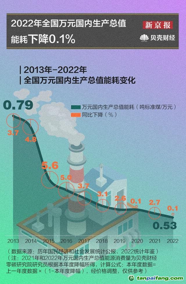 除了萬元碳排放實(shí)現(xiàn)下降,過去五年我國萬元GDP能耗同樣保持下降。2013年至2020年,全國每萬元GDP生產(chǎn)總值減少0.24噸標(biāo)準(zhǔn)煤。過去兩年,萬元國內(nèi)GDP能耗持續(xù)下降,同比降幅分別為2.7%和0.1%。“十四五”期間,我國將單位GDP能源消耗降低目標(biāo)值設(shè)定為13.5%,我國將以年均2%左右的能源消費(fèi)增長支撐5%左右的GDP增速。