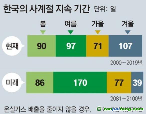 韓國的四季將以夏季為中心發(fā)生變化。如果不減少溫室氣體,夏天將比現(xiàn)在(97天)增加73天,持續(xù)170天。預(yù)計冬季將比現(xiàn)在(107天)減少兩個月以上,僅為39天。氣象廳根據(jù)日平均氣溫的變化區(qū)分四季。例如,將日平均氣溫上升到20度以上后不再下降的第一天視為夏天的開始。