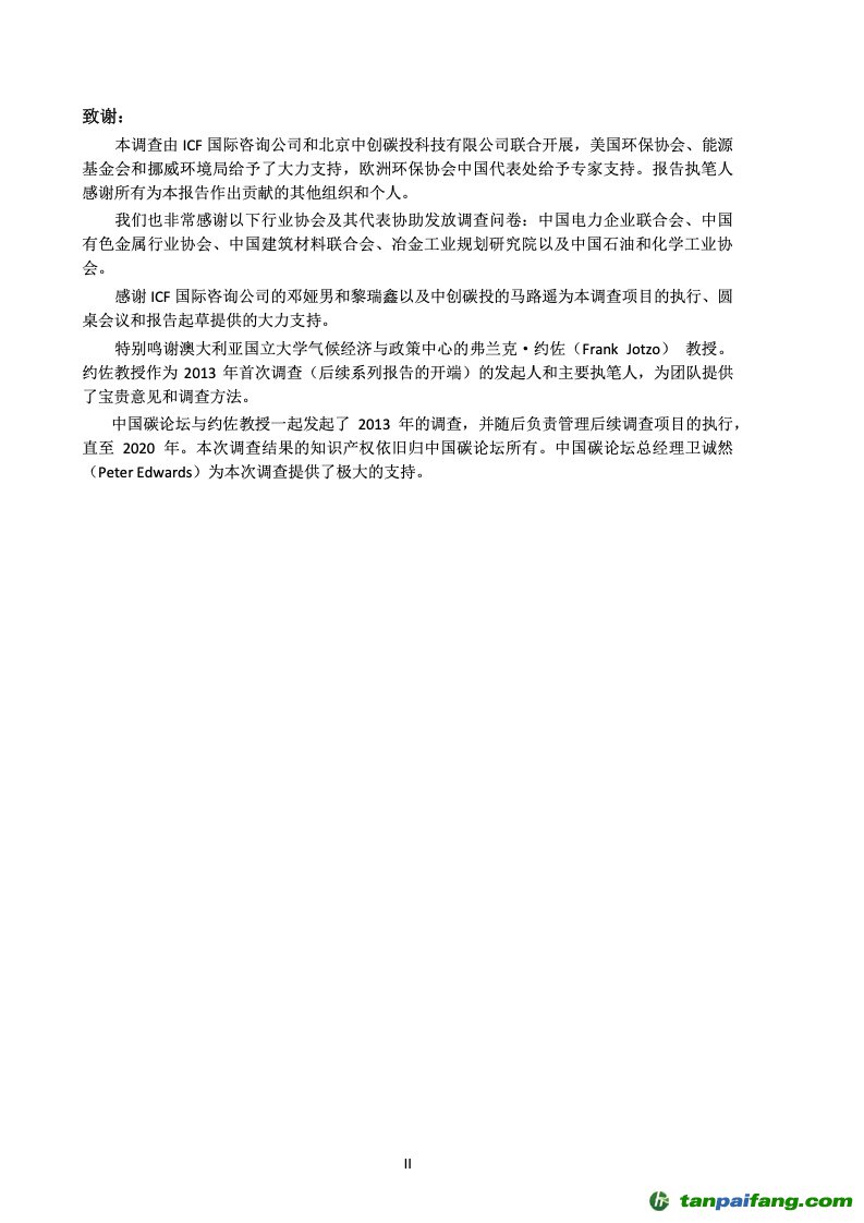 本年度碳價(jià)調(diào)查報(bào)告繼續(xù)由美國(guó)環(huán)保協(xié)會(huì)、能源基金會(huì)及挪威環(huán)境管理局提供資金支持,ICF 國(guó)際咨詢公司聯(lián)合北京中創(chuàng)碳投科技有限公司執(zhí)行,并得到了相關(guān)行業(yè)協(xié)會(huì)、電力集團(tuán)以及行業(yè)同仁的大力支持。 內(nèi).容.來(lái).自:中`國(guó)`碳#排*放*交*易^網(wǎng) t a np ai f an g.com