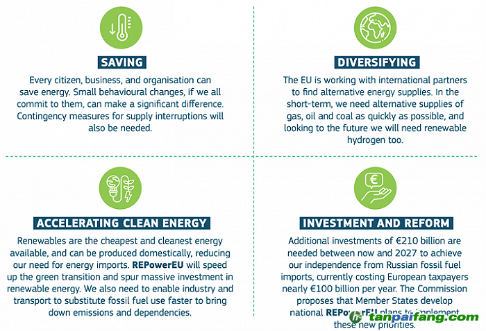 歐盟將從節(jié)能、能源供應多樣化、加速可再生能源建設、改革融資渠道等四個方面多管齊下,以完成能源綠色轉(zhuǎn)型。 本@文$內(nèi).容.來.自:中`國`碳`排*放^交*易^網(wǎng) t a np ai fan g.c om