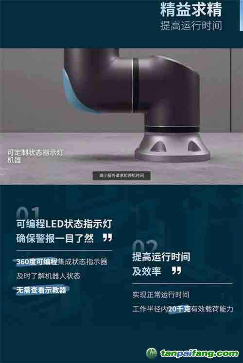 經(jīng)過風(fēng)險評估,ur機(jī)器人是不必設(shè)置安全圍欄的,旁邊協(xié)同工作的員工不用擔(dān)心會有危險,而且URe系列協(xié)作機(jī)械臂表面光滑,關(guān)節(jié)處無尖角,這樣就避免了員工在操作時可能出現(xiàn)的傷害,在經(jīng)過德國技術(shù)檢驗(yàn)協(xié)會的安全認(rèn)證后,隨即投入市場。6月新發(fā)布的UR20可編程LED狀態(tài)指示燈釋放警報信號,無需查看示教器,就可以將機(jī)器人狀態(tài)一目了然,提高工作場所安全性。