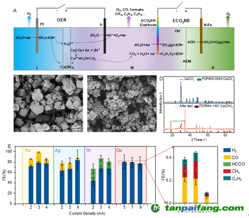 (A) 電解池體系中石灰石電化學(xué)轉(zhuǎn)化為消石灰和碳質(zhì)產(chǎn)物過程的示意圖;(B)生石灰、(C)消石灰掃描電子顯微鏡圖像及(D) X射線衍射譜圖;(E) 不同金屬電極在生石灰中性電解液體系中生成有價值碳質(zhì)產(chǎn)物的法拉第效率。南開大學(xué)供圖