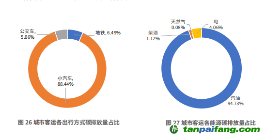 小汽車是城市客運出行的碳排放主體,擴大綠色出行比例對節(jié)碳意義重大。2018年全國城市客運碳排放總量為3.6億噸,其中小汽車占88.44%,地鐵占6.49%,公交車占5.06%。按能源類型劃分,汽油占比為94.73%, 電占比為4.06%,柴油占比為1.12%,天然氣占比為0.08%。居民城市客運人均碳排放為0.28噸/年,占人均生活碳排放的26.67%。