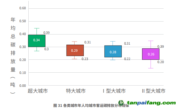 城市客運人均碳排放和城市發(fā)展水平呈現(xiàn)正相關。城市越發(fā)達,人均碳排放越高。這反映出,我國城市仍處于發(fā)展階段,機動化水平總體仍在提升,從超大城市、特大城市、I型大城市到II型大城市依次降低。同時,特大城市和Ⅰ型大城市的人均碳排放量較高可能與小汽車分擔率較高、出行距離較長相關。