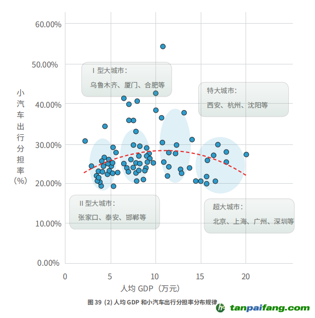研究發(fā)現(xiàn),城市出行特征與城市發(fā)展階段息息相關。城市小汽車出行指標與綠色出行相對,反映出行對環(huán)境的影響程度。從不發(fā)達城市到最發(fā)達城市,城市小汽車出行比例呈現(xiàn)標準庫茲納特曲線形態(tài)。 禸嫆@唻洎:狆國湠棑倣茭昜蛧 τāńpāīfāńɡ.cōm