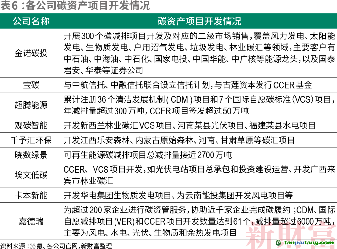 以金諾碳投為例,其主要接受排控企業(yè)的委托,代其進(jìn)行資產(chǎn)申報(bào)和簽發(fā),同時(shí)與擁有風(fēng)電、光伏、林業(yè)、濕地等資源方合作開(kāi)發(fā)CCER及國(guó)際自愿減排項(xiàng)目,并負(fù)責(zé)二級(jí)市場(chǎng)的包銷(表6)。目前,其已累計(jì)完成6000萬(wàn)噸CCER和CEA交易,交易金額超過(guò)30億元。 禸嫆@唻洎:狆國(guó)湠棑倣茭昜蛧 τāńpāīfāńɡ.cōm