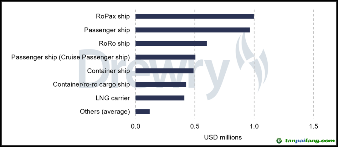 平均到每艘船舶,以2024年第一年的付費(fèi)水平,每艘客滾船(RoPax)或純客船將平均向歐盟 ETS 支付約100萬美元,而一艘集裝箱船將平均支付約50萬美元。