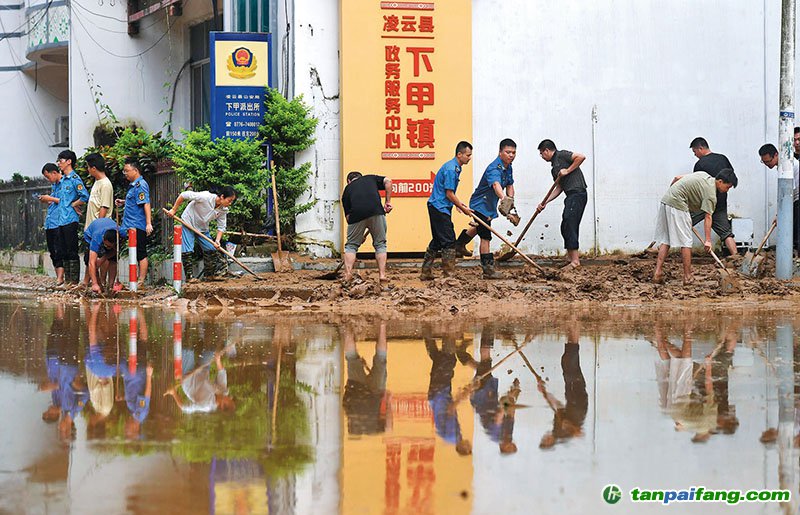 在廣西百色市凌云縣下甲鎮(zhèn),人們在清理道路上的淤泥(2023 年 8 月 24 日攝) 陸波岸攝 / 本刊