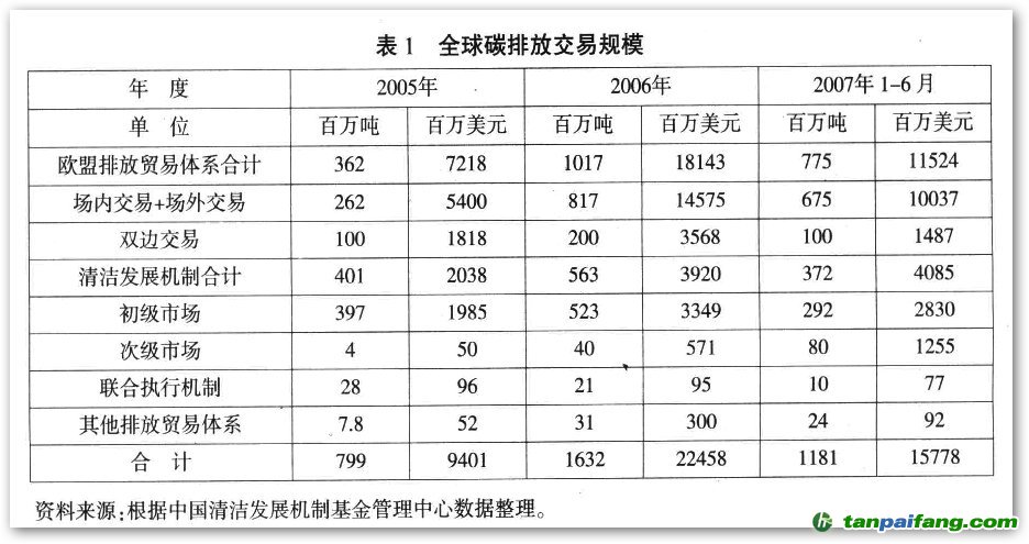 拍賣)的。京都議定書下的國(guó)際排放貿(mào)易(ETS)機(jī)制就是以配額交易為基礎(chǔ)的。在該機(jī)制下,人們采用總量管制和排放交易(cap&trade)的管理和交易模式,即:環(huán)境管理者會(huì)設(shè)置一個(gè)排放量的上限。受該體系管轄的每個(gè)企業(yè)將從環(huán)境管理者那里分配到相應(yīng)數(shù)量的“分配數(shù)量單位”(AAU),每個(gè)分配數(shù)量單位等于1噸C02當(dāng)量。如果在承諾期中這些企業(yè)的溫室氣體排放量低于該分配數(shù)量,則剩余的AAU(代表排放溫室氣體的許可權(quán))可以通過(guò)國(guó)際市場(chǎng)有償轉(zhuǎn)讓給那些實(shí)際排放水平高于其承諾而面臨違約風(fēng)險(xiǎn)的附件一國(guó)家企業(yè),以獲取利潤(rùn);反之,則必須到市場(chǎng)上購(gòu)買超額的“分配數(shù)量單位”(AAU),否則將會(huì)被處以重罰。隨著《京都議定書》生效,溫室氣體排放權(quán)交易市場(chǎng)得到了迅速的發(fā)展和擴(kuò)張,已成為全球貿(mào)易中的最新亮點(diǎn)。從2005年到2006年,僅僅一年間,市場(chǎng)規(guī)模就從近100億美元迅速攀升至220億美元,而2007年上半年的交易量比2006年同期又有近30%的增長(zhǎng)。具體數(shù)值參見表l。