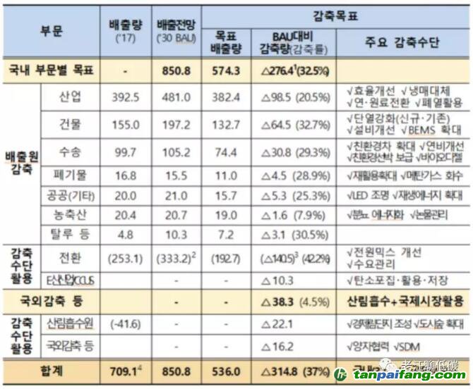 韓國在上個月22日公開了國家第二次應對氣候變化基本計劃(以下簡稱基本計劃),此時公布目的很明顯,就是為年底的智利(西班牙)氣候大會(COP25)做準備,這屆氣候大會主要目標是確定各國2030年的減排目標以及對應的MRV規(guī)則. 對此,韓國給出的答案是:2030年的減排目標為:相對于BAU排放減少32%。從數(shù)字上來看,就是到2030年的排放低于5.3億噸,而韓國2017年的溫室氣體排放為7.9億噸。