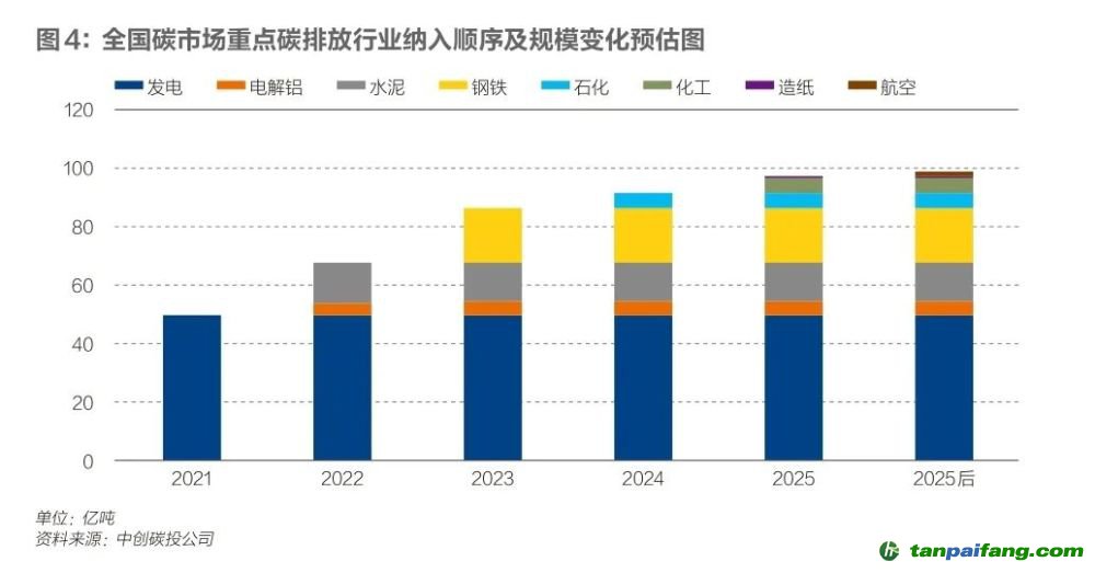在碳市場涵蓋的范圍方面,未來以怎樣的節(jié)奏納入更多行業(yè),尚未明確。首個控排行業(yè)發(fā)電行業(yè)的碳排放總量約為40億噸,若電解鋁、水泥、鋼鐵、化工、造紙、石化、航空等七大高耗能行業(yè)全部納入全國碳市場,碳排放總量預計在80億-100億噸/年之間。