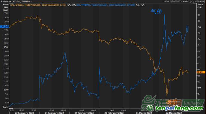 碳價的走勢和能源市場完全相反。因為擔(dān)心俄羅斯的能源供給受到影響,全球石油天然氣和煤炭價格以及大宗商品等都因為俄烏局勢而飆升。布倫特原油價格漲至8年新高110美元。歐洲近月TTF天然氣從2月23日的75歐元每MWh漲至近200歐元。煤炭價格則從此前的不到200美元每噸漲到最高450美元每噸。