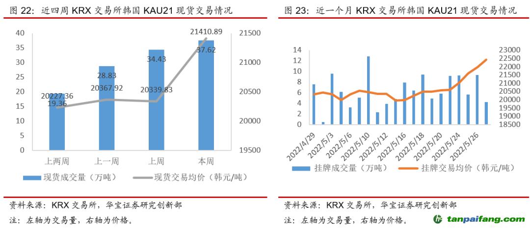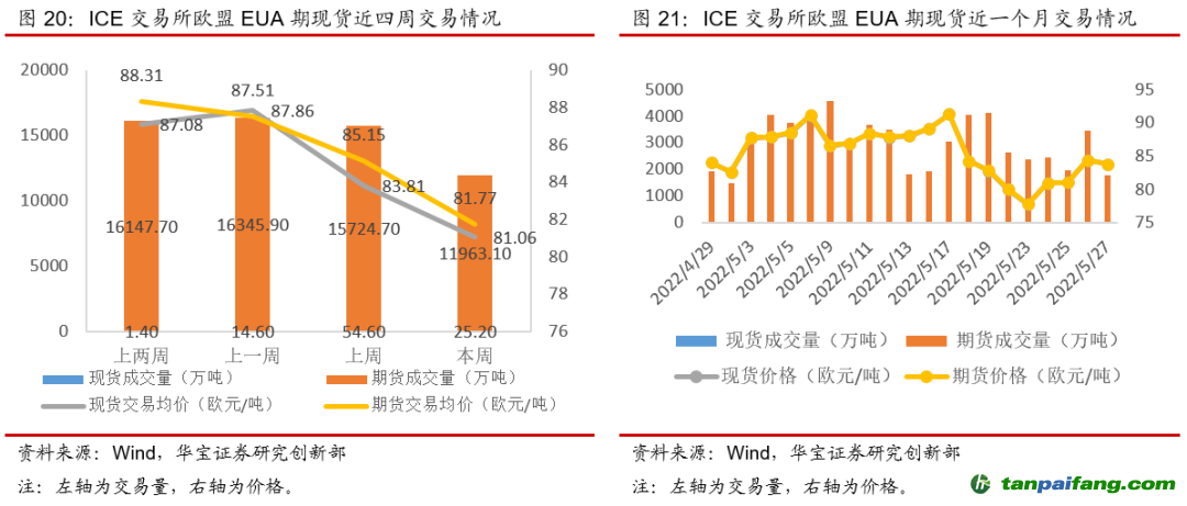 本周(5月23日-5月29日)國(guó)外碳配額二級(jí)市場(chǎng)交易量漲跌不一,碳價(jià)漲跌不一。歐盟市場(chǎng)本周EUA現(xiàn)貨成交量下滑53.85%,期貨成交量下滑降23.92%,現(xiàn)貨成交均價(jià)下降3.28%,期貨成交均價(jià)下跌3.97%,周內(nèi)期現(xiàn)貨碳價(jià)漲幅均超7.7%,周一跌至短期地位77歐元/噸左右后呈超跌反彈趨勢(shì),此外本周一級(jí)市場(chǎng)拍賣(mài)量同比上周減少19.87%,供應(yīng)量的減少也對(duì)悲觀情緒的緩解起到作用。韓國(guó)市場(chǎng)本周KAU21現(xiàn)貨成交量漲幅為9.27%,平均碳價(jià)有所上漲,漲幅為5.27%,且周內(nèi)碳價(jià)呈上漲趨勢(shì)。 本+文+內(nèi).容.來(lái).自:中`國(guó)`碳`排*放*交*易^網(wǎng) t a np ai fan g.com