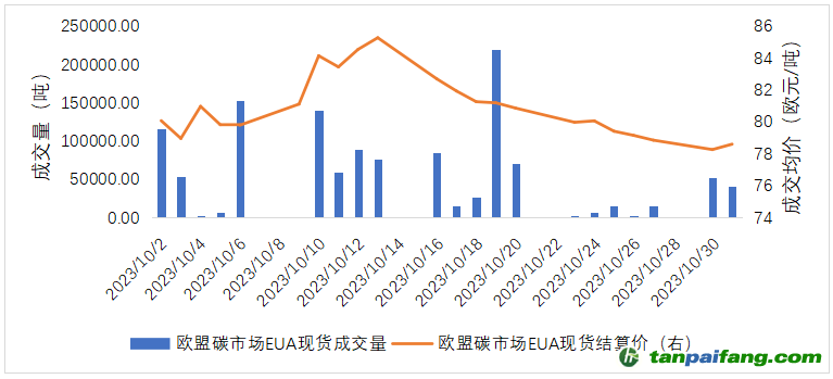 10月末,EUA價(jià)格下跌至80歐元/噸以下。化石燃料需求低迷,抑制了對(duì)EUA的需求。