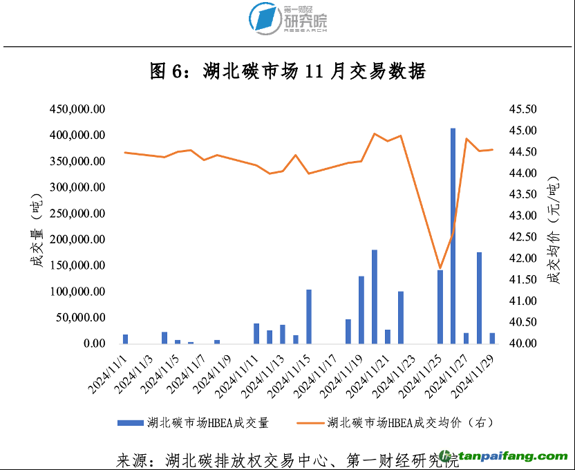 11月湖北碳市場碳排放配額(HBEA)交易成交量156.08萬噸,成交額6829.91萬元。期間,最高價(jià)45.96元/噸,最低價(jià)40.30元/噸,成交均價(jià)43.76元/噸。11月最后一個(gè)交易日收盤價(jià)44.57元/噸,較10月最后一個(gè)交易日收盤價(jià)44.78元/噸下跌0.47%。截至11月30日,HBEA(不包括遠(yuǎn)期、拍賣、逆回購和還碳)累計(jì)成交量1.36億噸,累計(jì)成交額34.15億元。