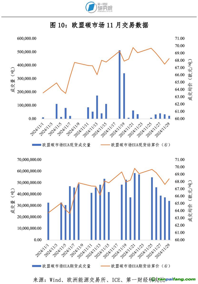 11月歐盟碳排放配額(EUA)現(xiàn)貨成交量180.90萬噸,期貨成交量9.34億噸。11月EUA現(xiàn)貨結(jié)算價(jià)最低63.49歐元/噸,最高69.79歐元/噸;期貨結(jié)算價(jià)最低63.63歐元/噸,最高69.83歐元/噸。 本*文`內(nèi)/容/來/自:中-國-碳^排-放“交|易^網(wǎng)-tan pai fang . c o m