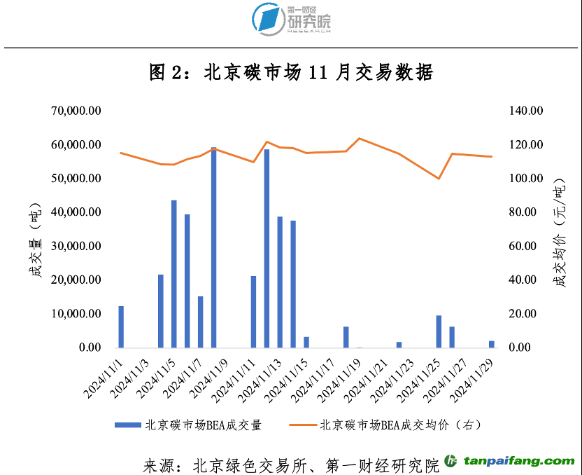 11月北京碳市場碳排放配額(BEA)成交量37.93萬噸,成交額4368.79萬元,成交均價(jià)115.18元/噸。11月最后一個(gè)交易日成交均價(jià)113.30元/噸,較10月最后一個(gè)交易日成交均價(jià)116.73元/噸下跌2.94%。截至11月30日,BEA累計(jì)成交量5764.98萬噸(公開交易2073.98萬噸,協(xié)議轉(zhuǎn)讓3691.00萬噸),累計(jì)成交額31.05億元。 本`文-內(nèi).容.來.自:中`國^碳`排*放*交^易^網(wǎng) ta np ai fan g.com