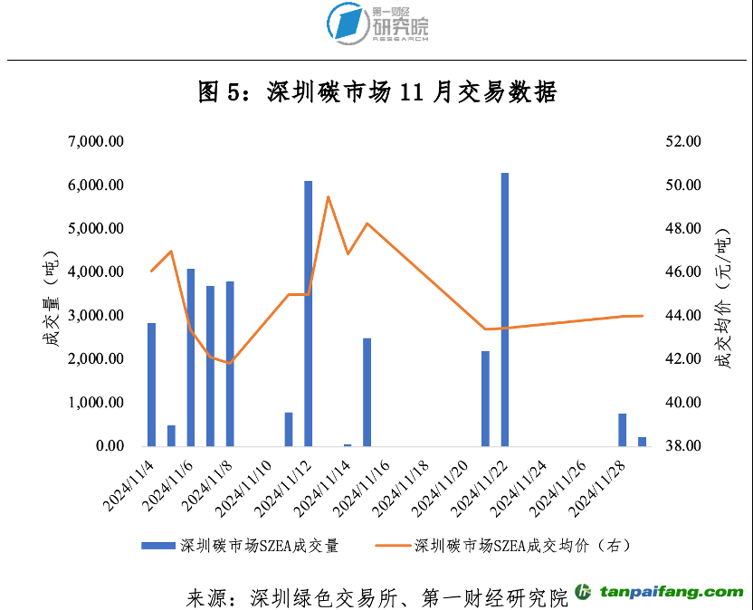 11月深圳碳市場碳排放配額(SZEA)成交量3.39萬噸,成交額149.58萬元。期間,最高價(jià)49.50元/噸,最低價(jià)40.00元/噸,成交均價(jià)44.09元/噸。11月最后一個(gè)交易日收盤價(jià)44.03元/噸,較10月最后一個(gè)交易日收盤價(jià)50.90元/噸下跌13.50%。截至11月30日,SZEA累計(jì)成交量7715.69萬噸,累計(jì)成交額20.49億元。