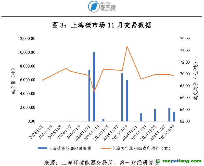 EUA價(jià)格在連續(xù)下跌兩個(gè)月后,于11月出現(xiàn)回升,價(jià)格月底時(shí)達(dá)到70歐元/噸左右。雖然市場供應(yīng)增加,但配額需求同樣強(qiáng)勁,從而推高歐盟碳價(jià)。