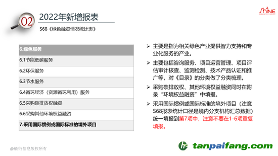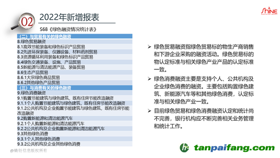 2022年新增S68《綠色融資情況統(tǒng)計(jì)表》,主要指標(biāo)來源于T115報(bào)表,統(tǒng)計(jì)口徑與T115報(bào)表基本一致,但在統(tǒng)計(jì)內(nèi)容上進(jìn)行了縮減,無需統(tǒng)計(jì)綠色信貸節(jié)能減排量數(shù)據(jù),報(bào)表合計(jì)欄目和附錄也做了簡化。