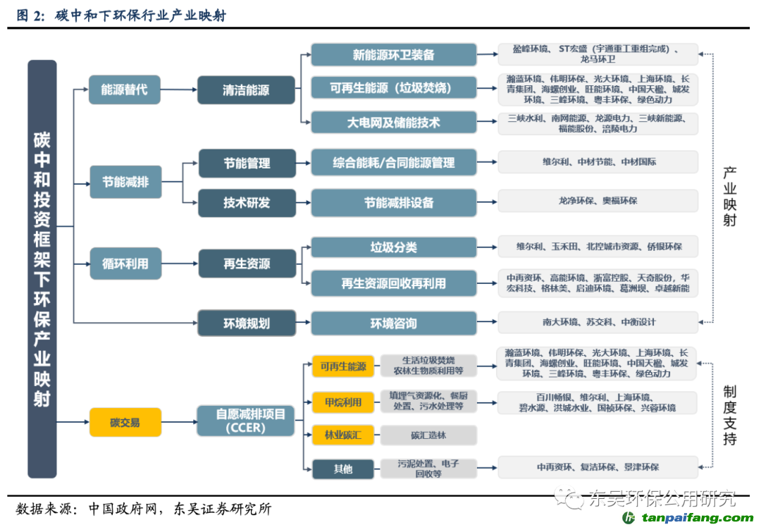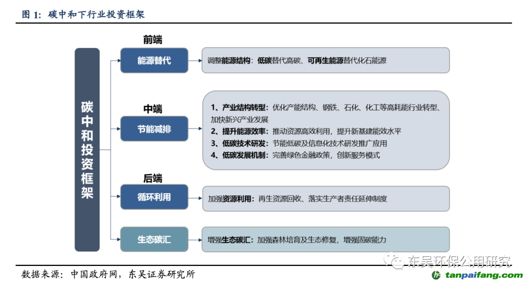 從行業(yè)投資框架及環(huán)保產(chǎn)業(yè)映射角度來看,我們將分別從能源替代、節(jié)能減排、再生資源、環(huán)境咨詢和碳交易等角度指出環(huán)保受益雙碳目標(biāo)的板塊。