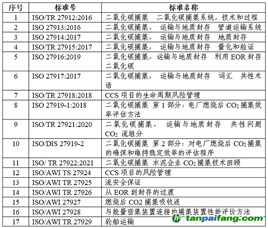 2. ISO/TC265的工作范圍包括:關(guān)于碳捕集與封存(CCS)領(lǐng)域相關(guān)活動的物質(zhì)、設(shè)備、環(huán)境規(guī)劃與管理、風(fēng)險(xiǎn)管理、量化與驗(yàn)證等方面的標(biāo)準(zhǔn)制定。ISO/TC265已發(fā)布和正在制定的標(biāo)準(zhǔn),如表2所示。 本`文@內(nèi)-容-來-自;中_國_碳排0放_交-易=網(wǎng) t an pa ifa ng . c om