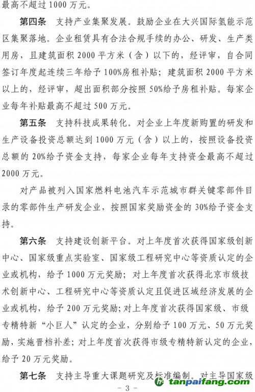 第四條支持企業(yè)聚集發(fā)展。鼓勵(lì)企業(yè)在大興國(guó)際氫能示范區(qū)集聚落地。企業(yè)租賃具有合法合規(guī)手續(xù)的辦公、研發(fā)、生產(chǎn)類用房,且建筑面積2000平米(含)以下的,經(jīng)評(píng)審,自合同簽訂年度起連續(xù)三年給予100%房租補(bǔ)貼;建筑面積2000平米以上的,經(jīng)評(píng)審,超出面積部分按照50%給予房租補(bǔ)貼。每家企業(yè)每年補(bǔ)貼最高不超過(guò)500萬(wàn)元。 本+文`內(nèi)/容/來(lái)/自:中-國(guó)-碳-排-放-網(wǎng)-tan pai fang . com