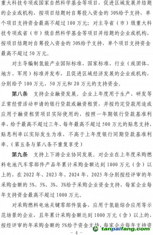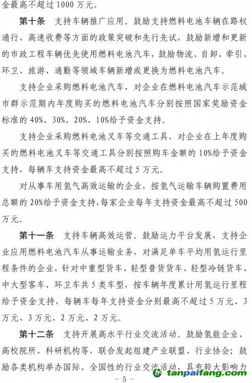 第九條支持上下游企業(yè)協(xié)同發(fā)展。對(duì)企業(yè)在上年度采購(gòu)燃料電池汽車零部件產(chǎn)品年累計(jì)采購(gòu)金額達(dá)到1000萬(wàn)元(含)以上的,在2022年、2023年、2024年、2025年分別按經(jīng)評(píng)審的年采購(gòu)金額的5%、5%、3%、3%給予采購(gòu)企業(yè)資金支持,每家企業(yè)每年支持資金最高不超過(guò)1000萬(wàn)元。 禸嫆@唻洎:狆國(guó)湠棑倣茭昜蛧 τāńpāīfāńɡ.cōm